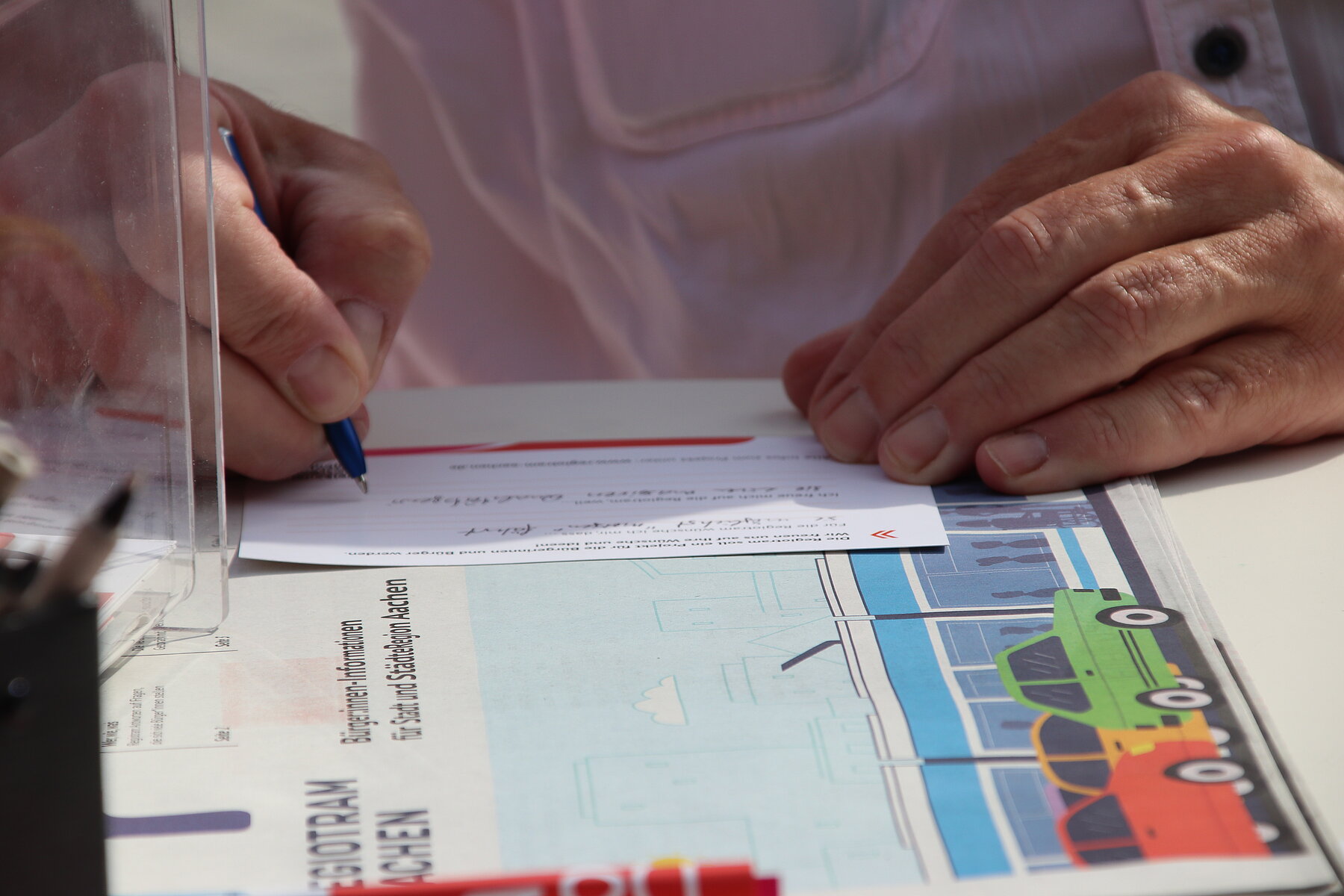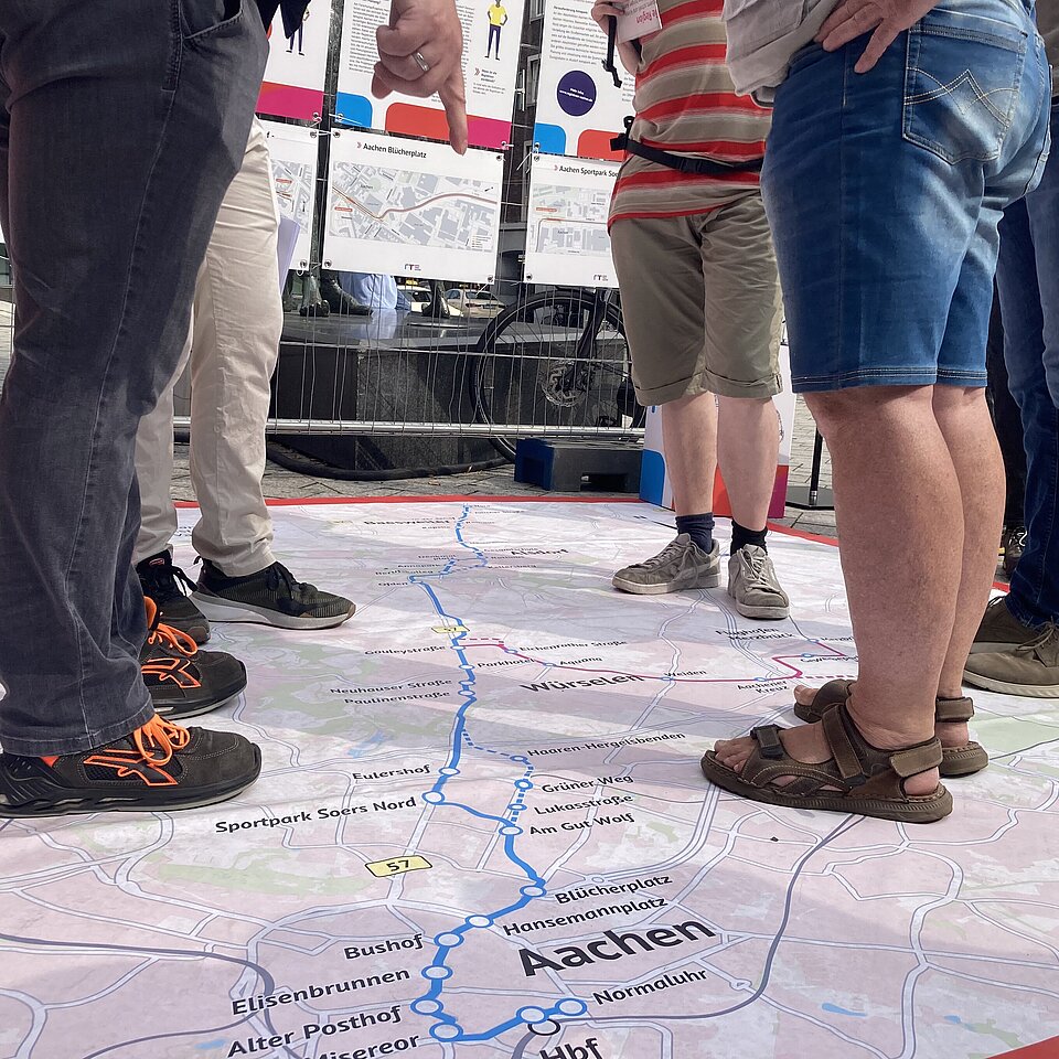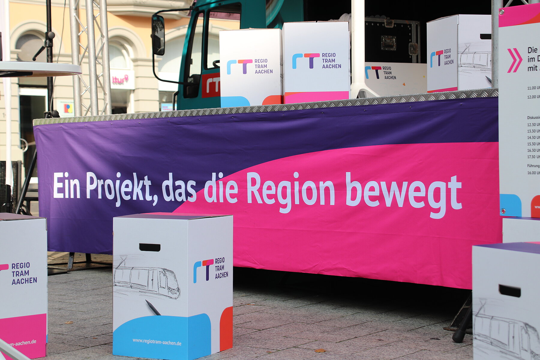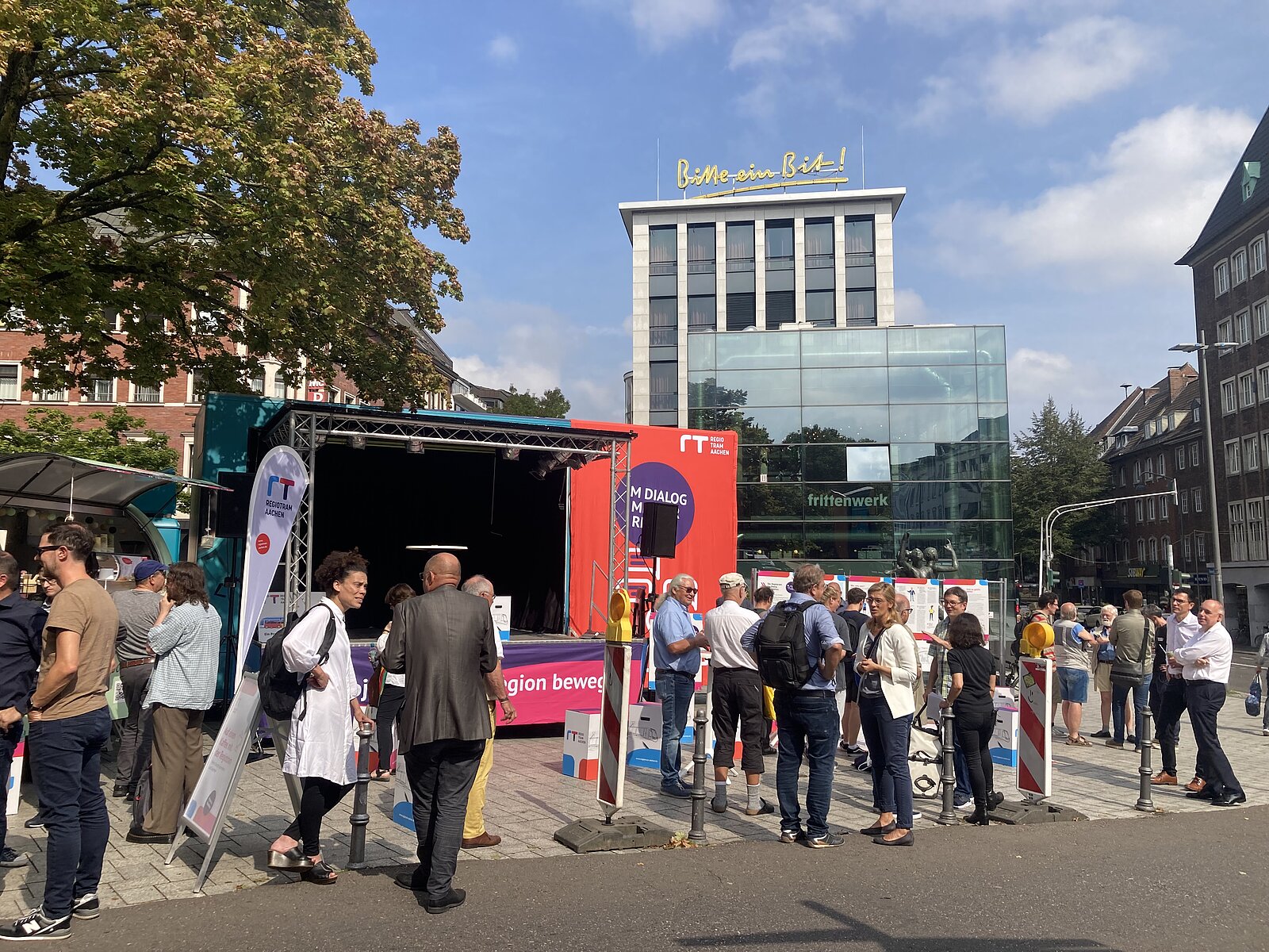 Ein weiterer elementarer Bestandteil des Projekts Regiotram ist der Bürgerdialog: Die Bürgerinnen und Bürger sollen über alle (Planungs-)Schritte umfassend informiert werden und sich konstruktiv einbringen können. Im Spätsommer 2023 zeigte eine Roadshow deutlich, dass das Angebot zum Dialog angenommen wird: An den Standorten Aachen, Würselen, Alsdorf und Baesweiler erreichte die Mischung aus Bühnenprogramm und Info-Ausstellung mehrere Tausend Menschen.