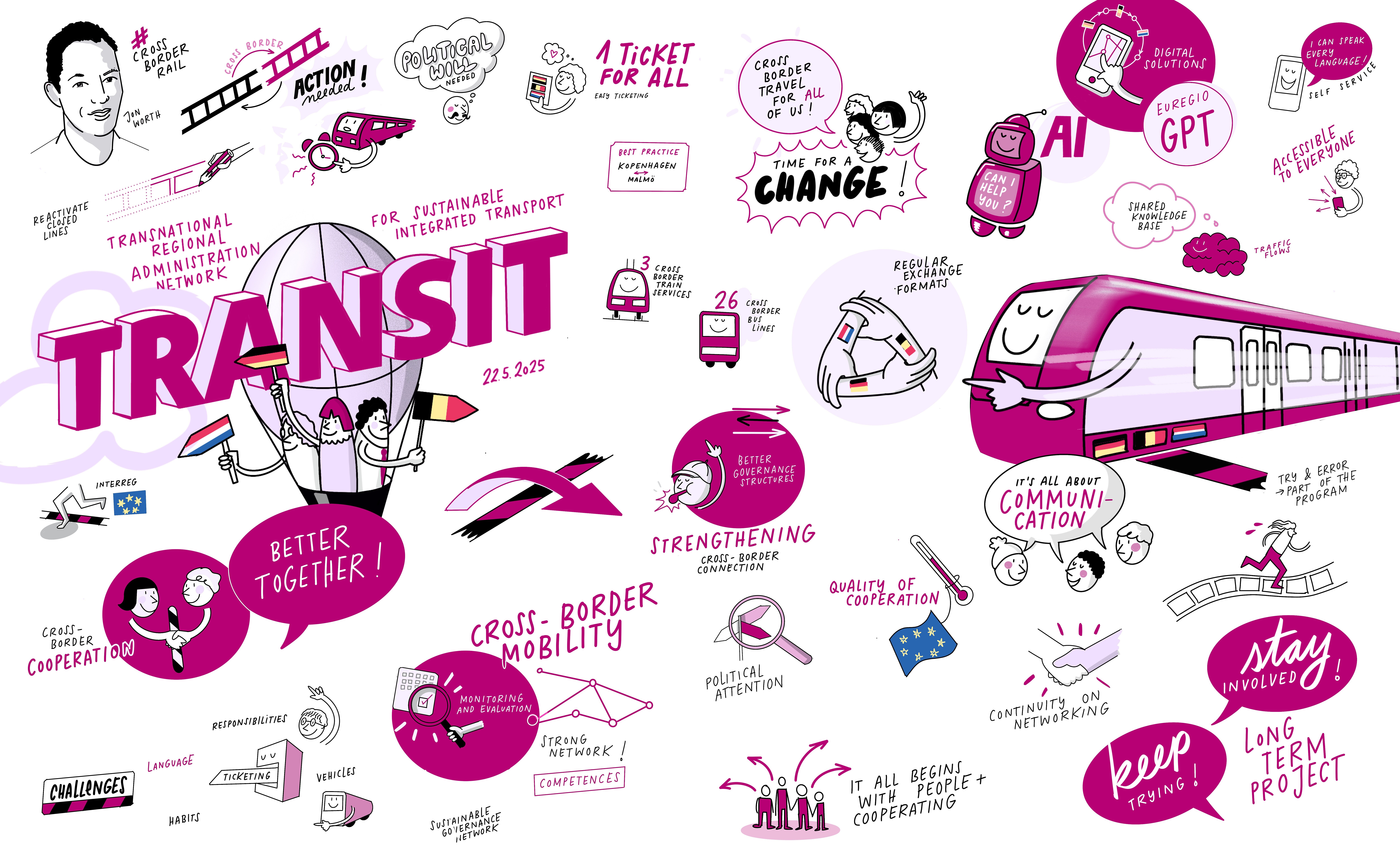 TRANSIT steht für „Transnational Regional Administration Network for Sustainable Integrated Transport“ und verfolgt das Ziel, die grenzüberschreitende Kooperation zwischen den Akteur*innen im Nahverkehr durch die Entwicklung tragfähiger Governance-Strukturen zu stärken und dadurch eine spürbare Verbesserung der Mobilitätsangebote in der Euregio Maas-Rhein zu erreichen. Das Projekt wird im Rahmen des Interreg-Programms Maas-Rhein (NL-BE-DE) durchgeführt. Dem Konsortium steht ein Budget in Höhe von rund 3 Millionen Euro zur Verfügung, die Hälfte davon stammt aus EU-Mitteln, die NRW-Partner erhalten zusätzlich 30 Prozent der Kosten vom Land NRW. Dem AVV steht als Lead-Partner ein Budget von rund 900.000 Euro zur Verfügung, wovon 20 Prozent aus Eigenmitteln bestehen. Die Projektlaufzeit beträgt drei Jahre (2025 bis 2027).