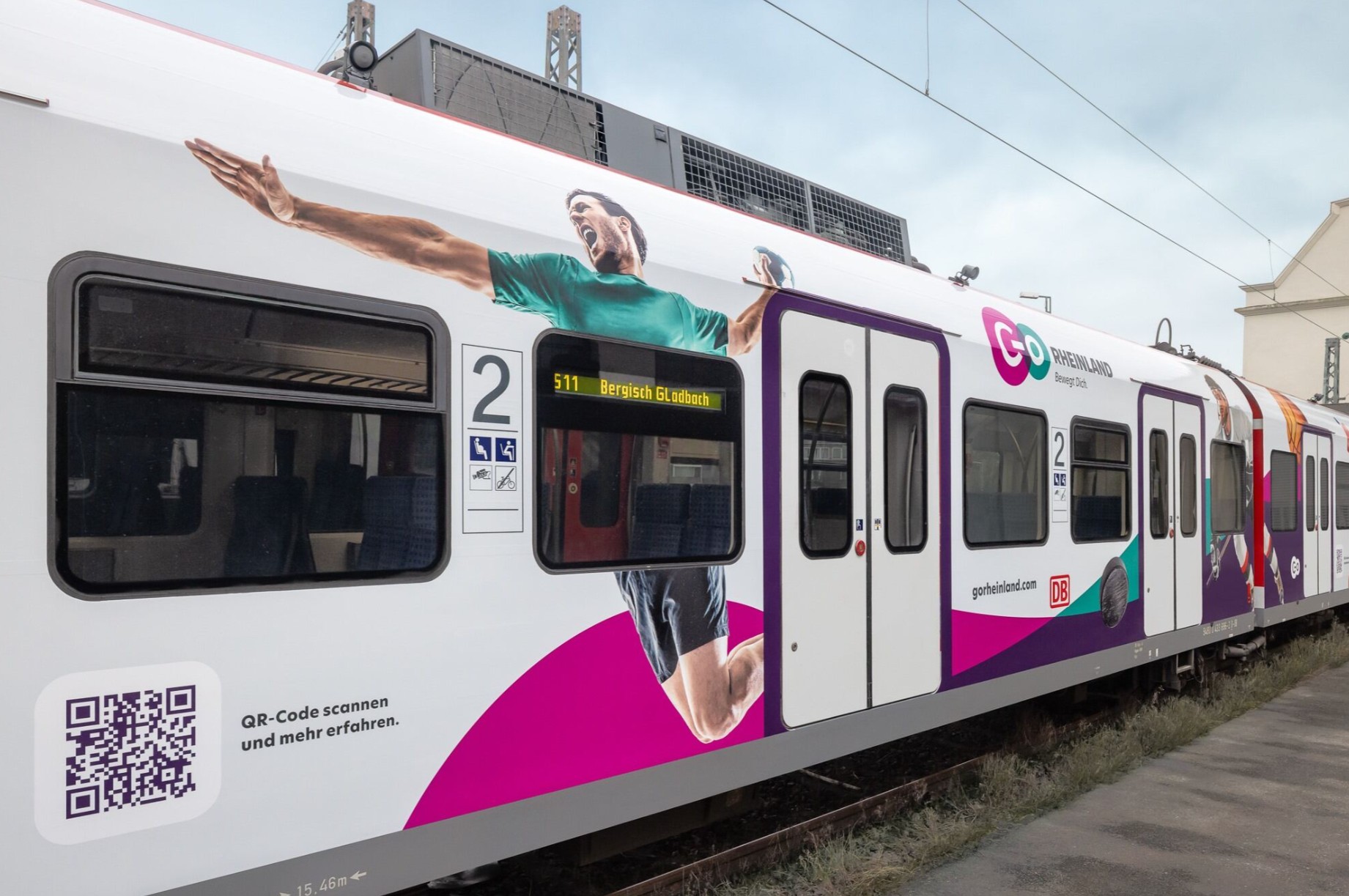 Seit Mitte Februar ist ein besonderer Eyecatcher auf den Strecken im Verbandsgebiet unterwegs: Die Botschafter-S-Bahn, ein vollständig folierter Zug des Typs ET 423, präsentiert Bilder der Sport-Botschafter*innen von go.Rheinland und wirbt sichtbar für Mobilität und Sport in der Region.